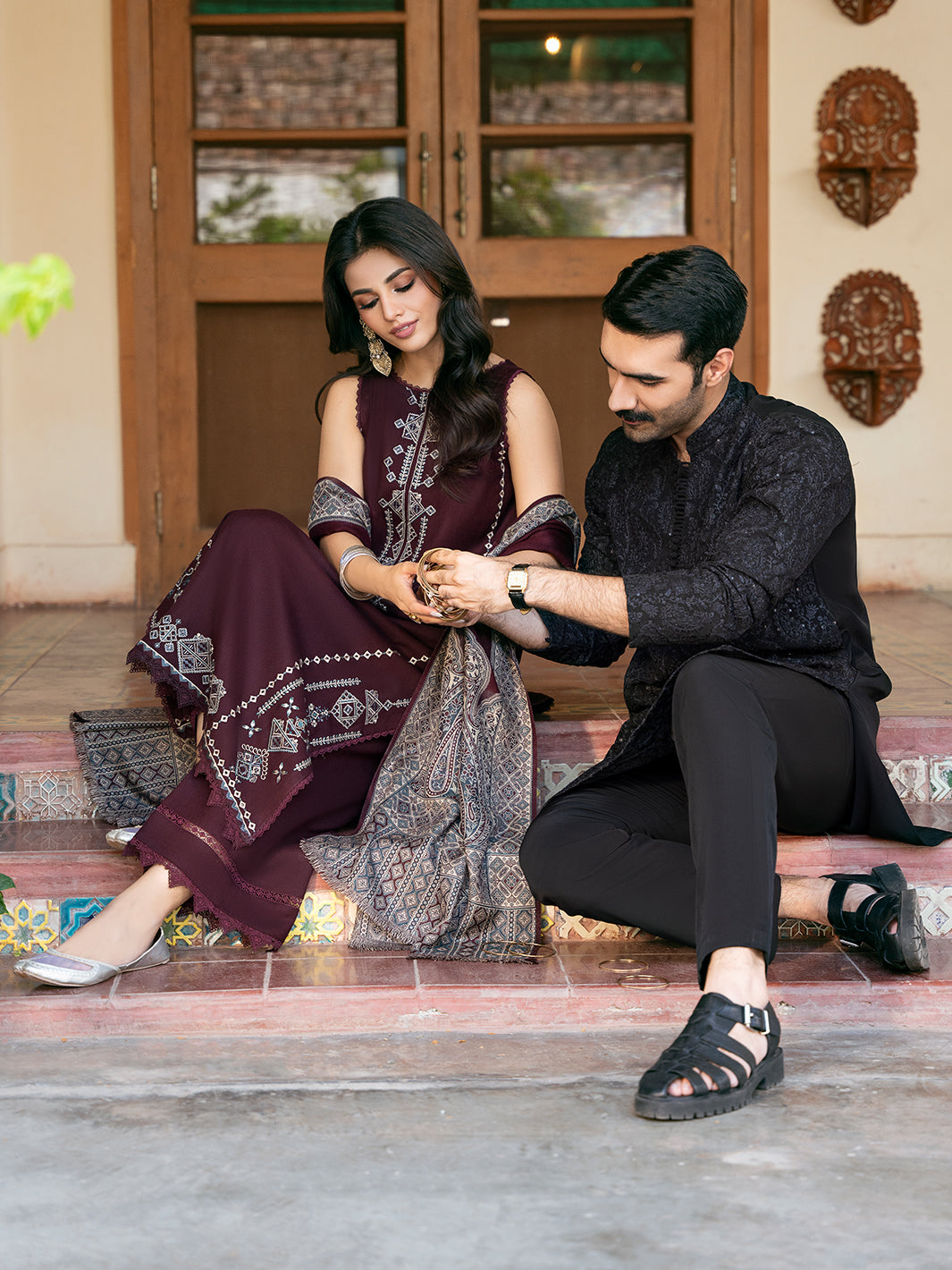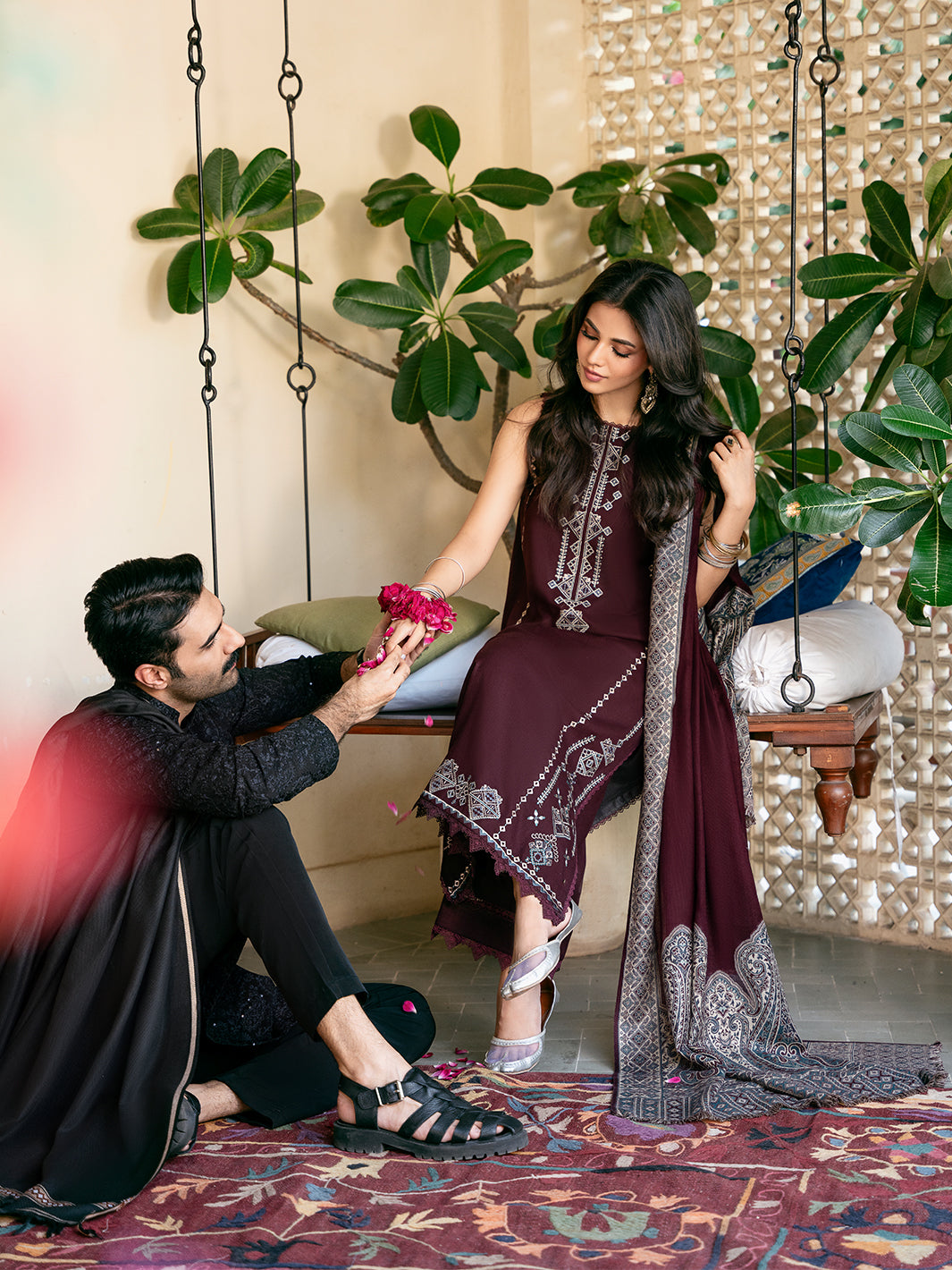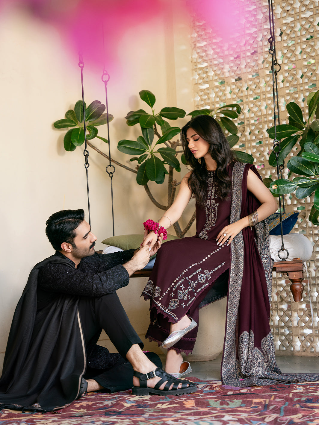 Afsana a timeless ode to winter elegance crafted from the soft embrace of Italian wool, this ensemble blends comfort with understated luxury. The intricately embroidered front and sleeves add a touch of refined grace, while the plain dyed back ensures a balanced silhouette. Paired with a stunning jacquard shawl that exudes warmth and charm, and complemented by a plain dyed trouser this piece is designed to wrap you in effortless sophistication for the season