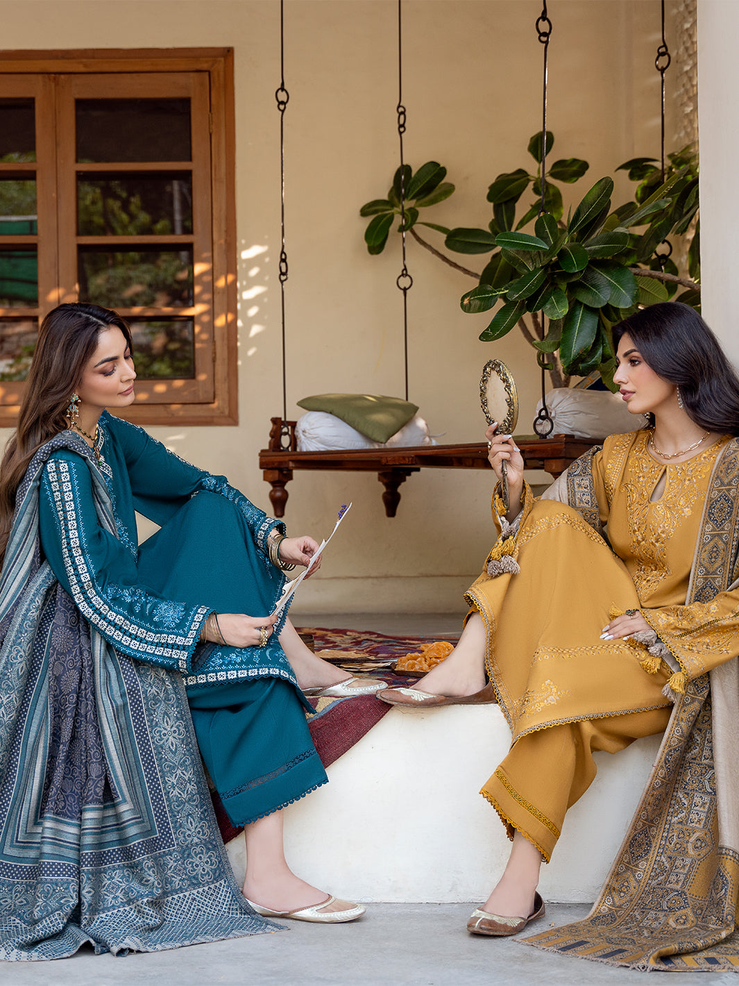 Ridaa from the Musafir Winter Collection ’25 is a timeless ode to winter elegance. Crafted from luxurious Italian wool, it features a delicately embroidered front and sleeves that exude sophistication, paired with a plain dyed back for an effortless balance of grace and refinement. A beautifully textured jacquard shawl and soft dyed trousers complete the look, wrapping the season in warmth, charm, and quiet luxury