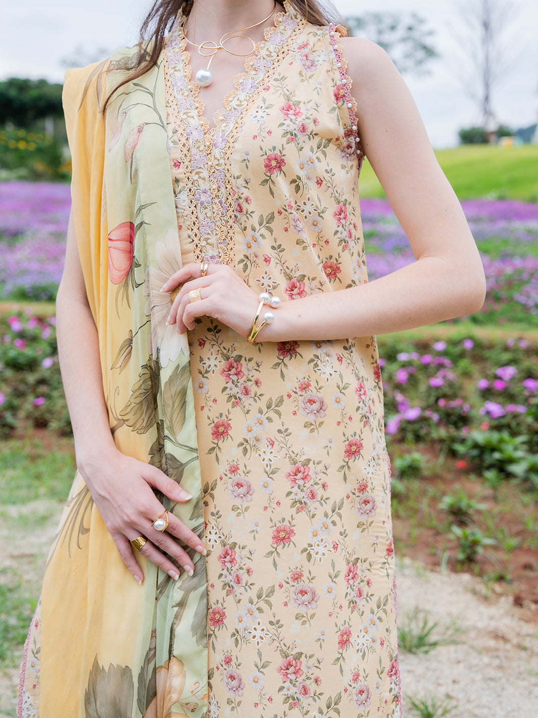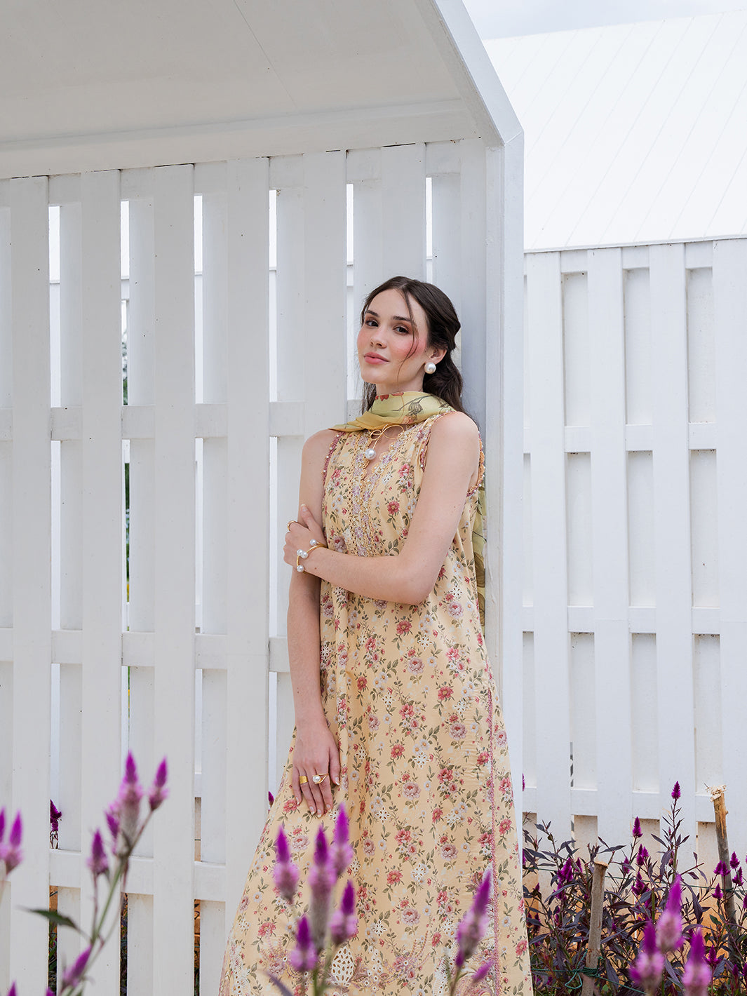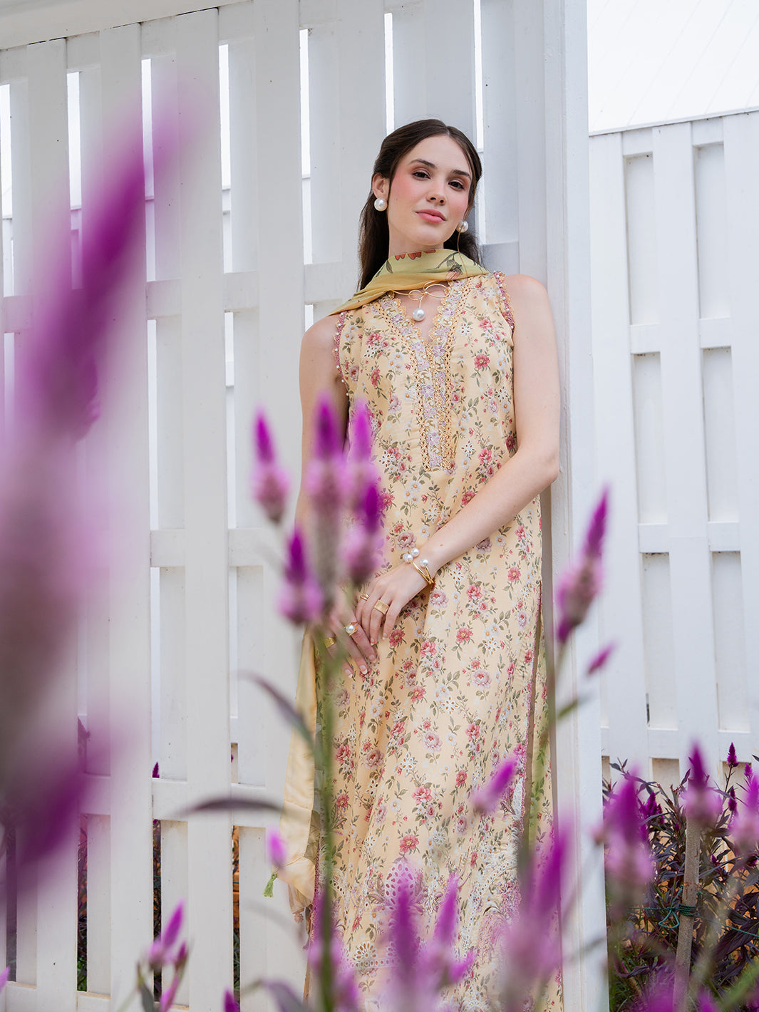 Aven from the Oh So Cherry edit is crafted in soft digital printed lawn, featuring intricate embroidered detailing on the front and sleeves, complemented by a printed back. The shirt is refined with a delicate organza patch on the neckline, adding a subtle touch of sophistication. Paired with a digitally printed chiffon dupatta and plain dyed trousers, Aven offers a perfect blend of comfort, elegance, and airy summer grace — a timeless choice for warm, sunlit days.