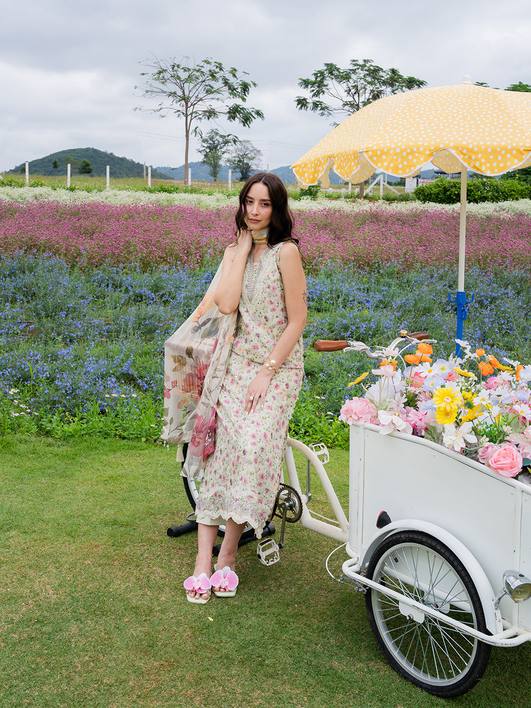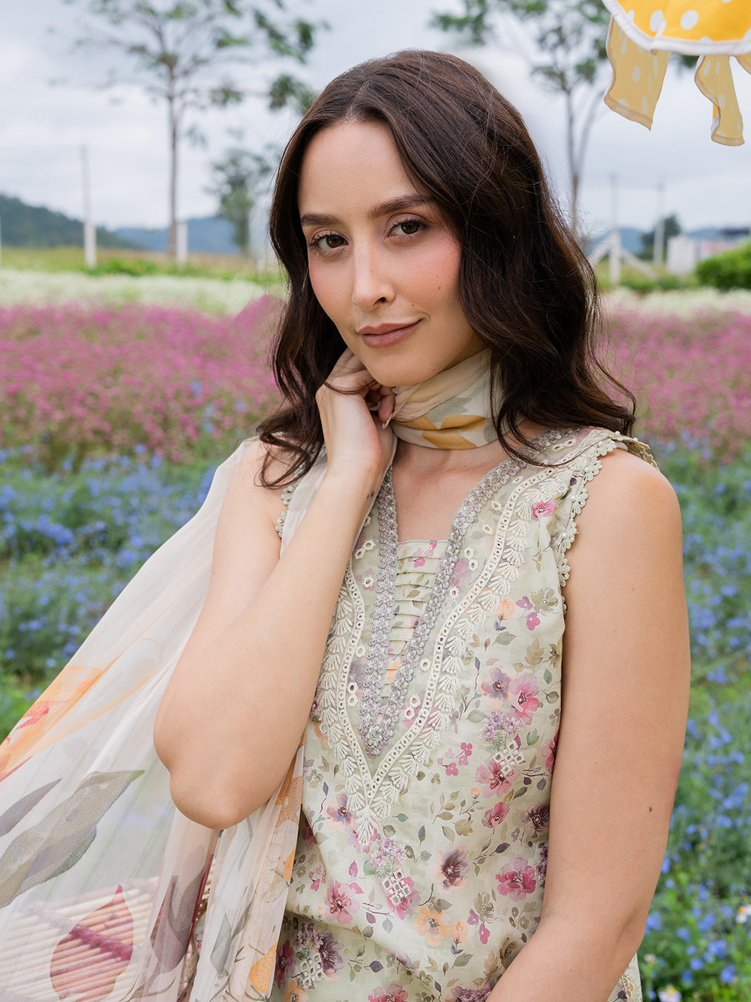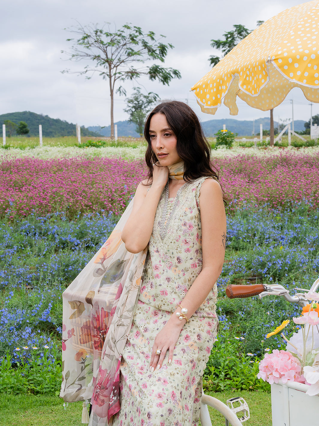 Bella from the Oh So Cherry edit captures the essence of soft summer elegance. Crafted in digital printed lawn, the shirt features intricate embroidered detailing on the front and sleeves, complemented by a printed back for a harmonious design. A delicately finished organza neckline adds a subtle, refined touch, while the digitally printed chiffon dupatta drapes effortlessly to enhance the light and airy aesthetic. Paired with plain dyed trousers, Bella is designed to offer comfort, grace, and timeless sophistication — perfect for sunlit days and warm, breezy moments
