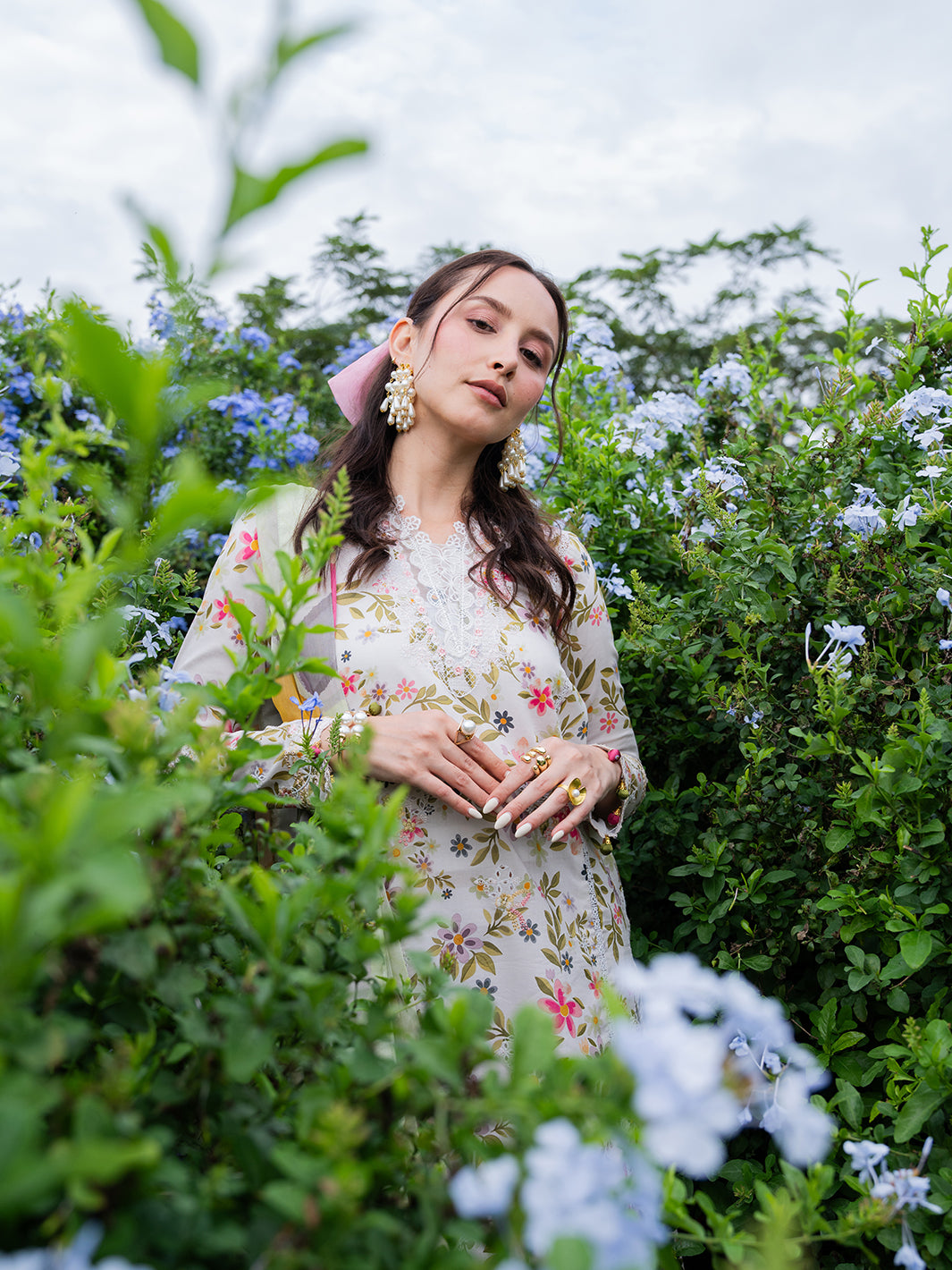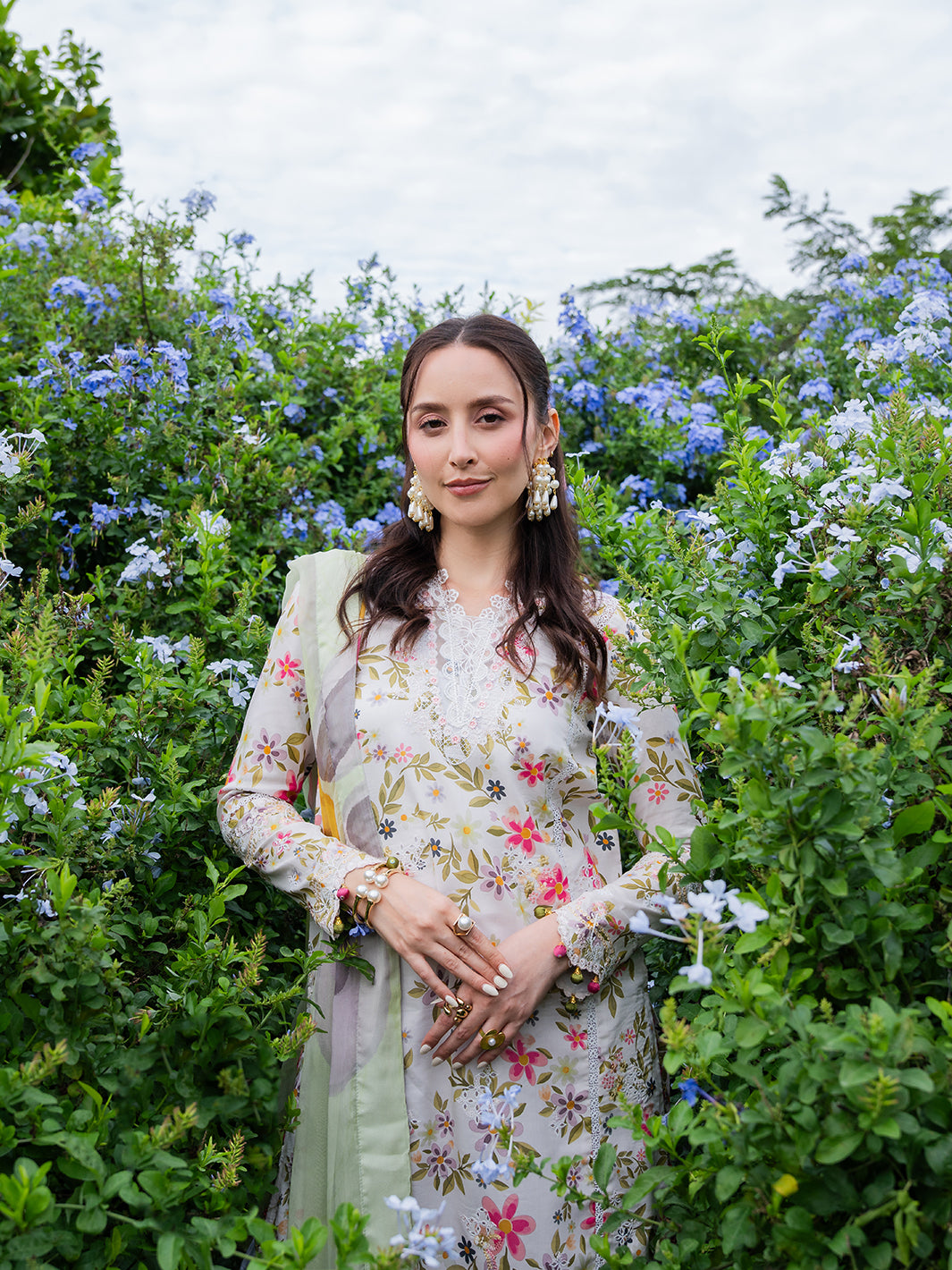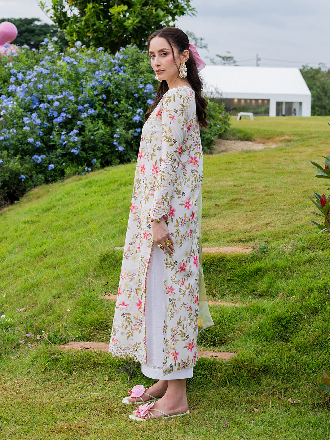 Elorin from the Oh So Cherry edit is crafted in soft digital printed lawn, featuring intricate embroidered detailing on the front and sleeves, complemented by a printed back for a cohesive and refined design. A delicate organza neckline adds subtle sophistication, while the digitally printed chiffon dupatta enhances the airy, breezy aesthetic. Paired with plain dyed trousers, Elorin offers a graceful combination of comfort, elegance, and effortless summer charm — perfect for light, sunlit days.