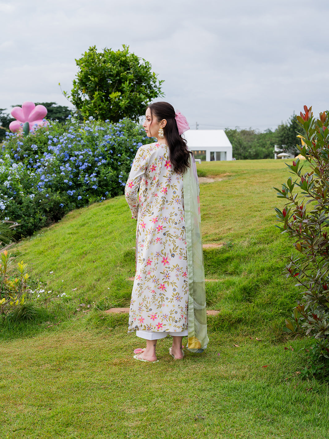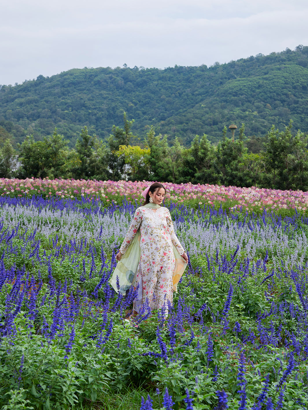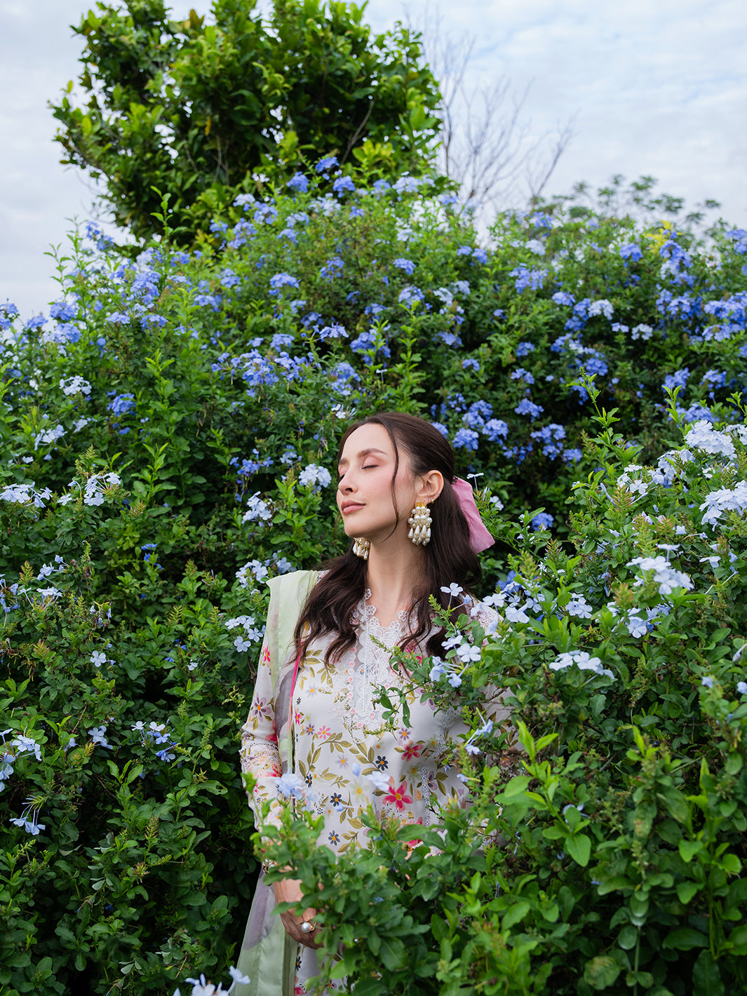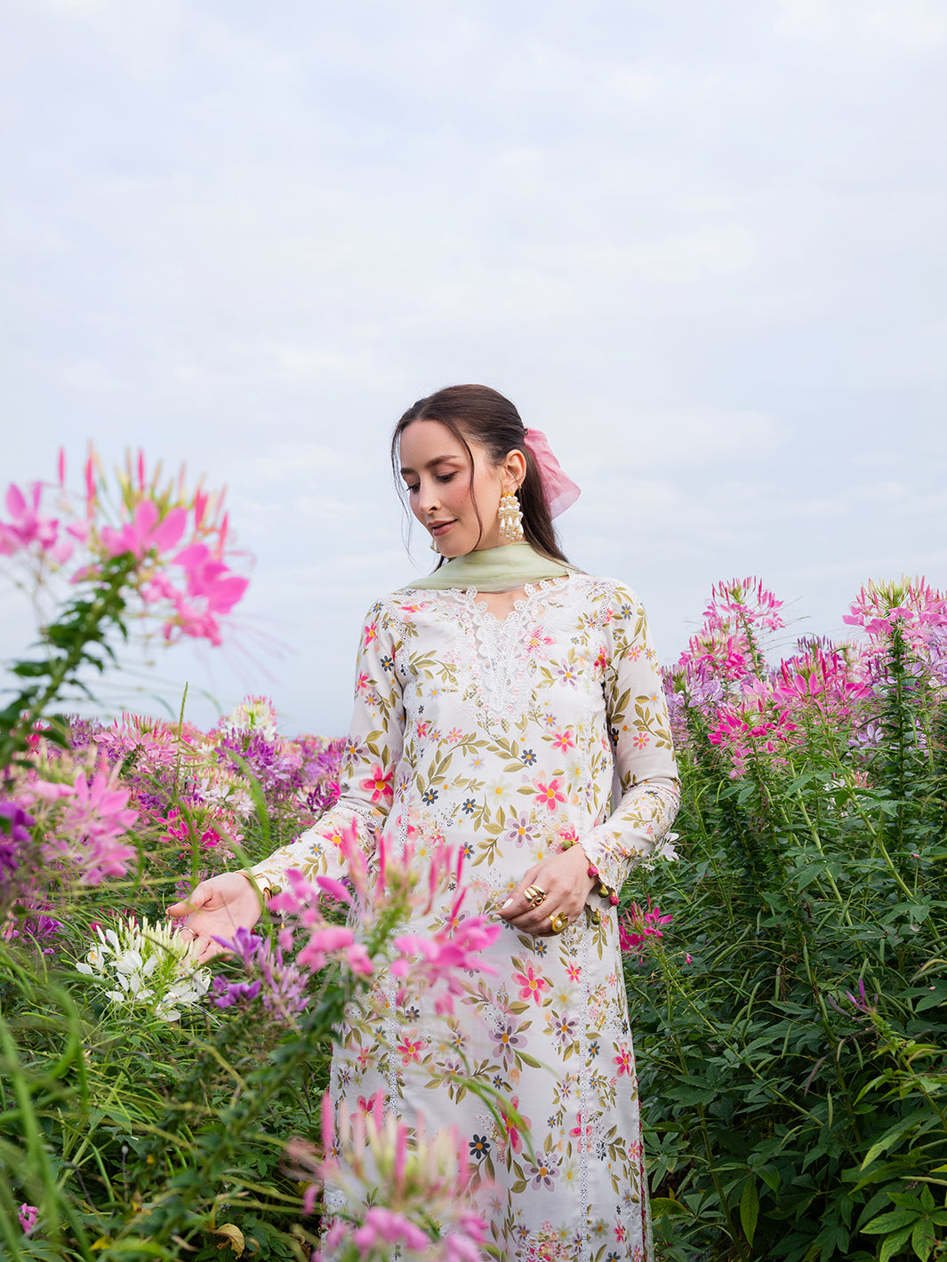 Elorin from the Oh So Cherry edit is crafted in soft digital printed lawn, featuring intricate embroidered detailing on the front and sleeves, complemented by a printed back for a cohesive and refined design. A delicate organza neckline adds subtle sophistication, while the digitally printed chiffon dupatta enhances the airy, breezy aesthetic. Paired with plain dyed trousers, Elorin offers a graceful combination of comfort, elegance, and effortless summer charm — perfect for light, sunlit days.