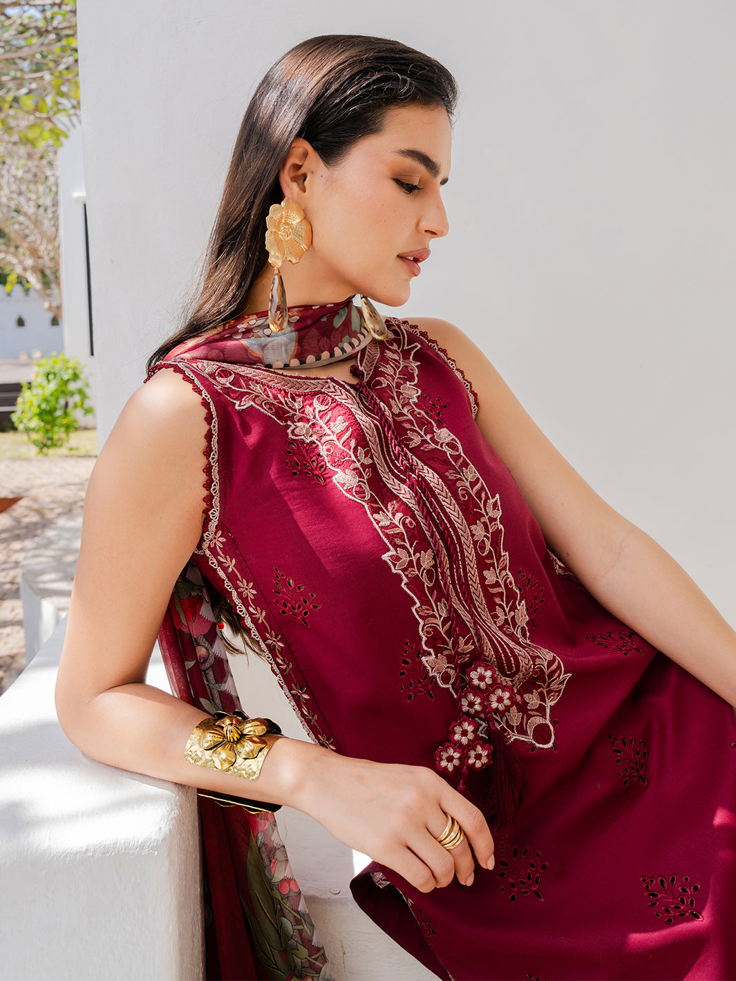 Eshaal from the Dareen Luxury Lawn collection is where elegance meets ease soft lawn fabric intricate embroidery and delicate organza detailing create a look that’s effortlessly refined the front slit adds movement and the digitally printed silk dupatta adds a whisper of color completed with plain dyed cotton trousers for a harmonious luxurious finish.