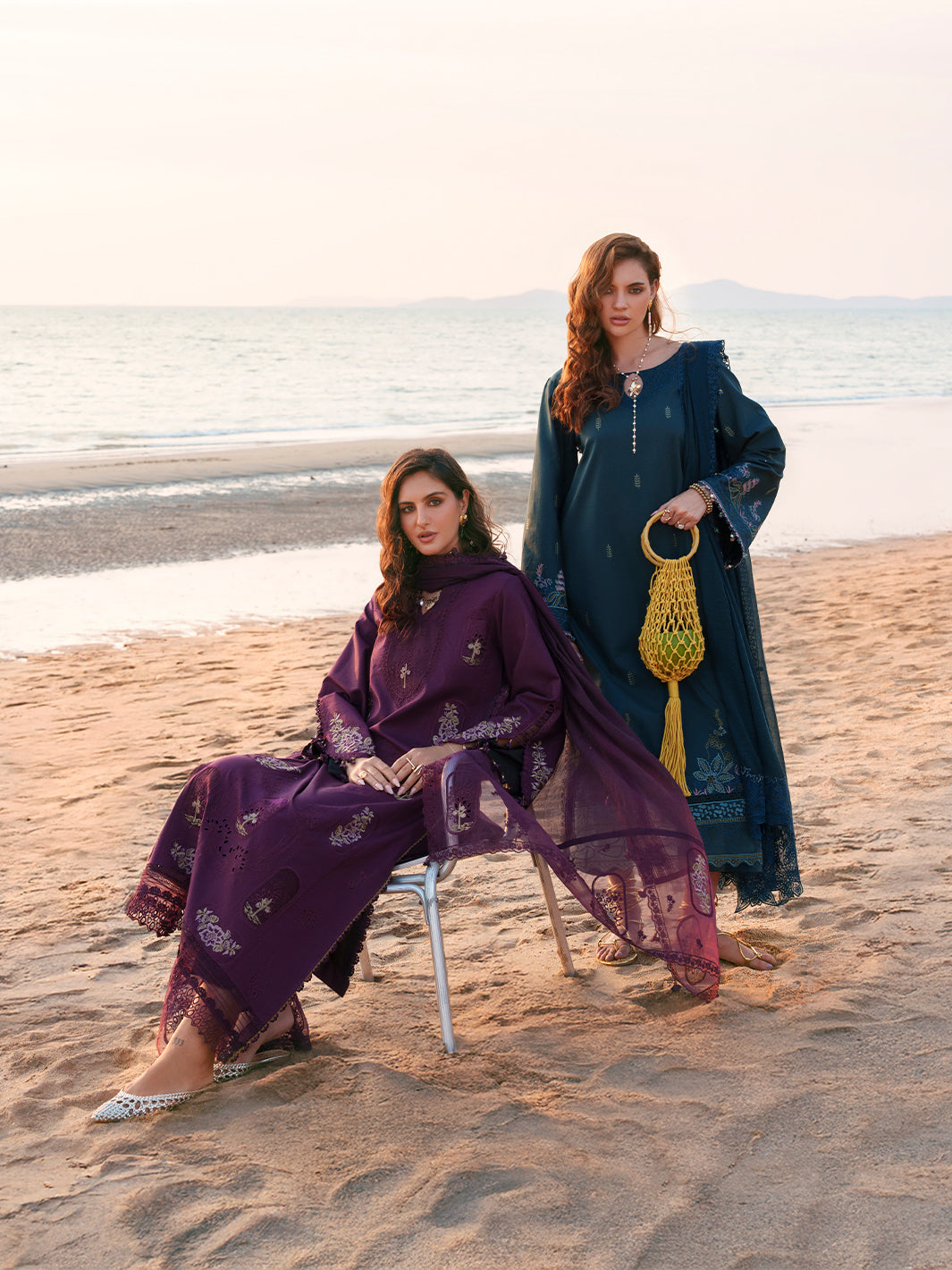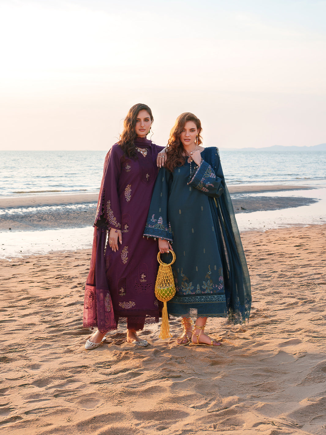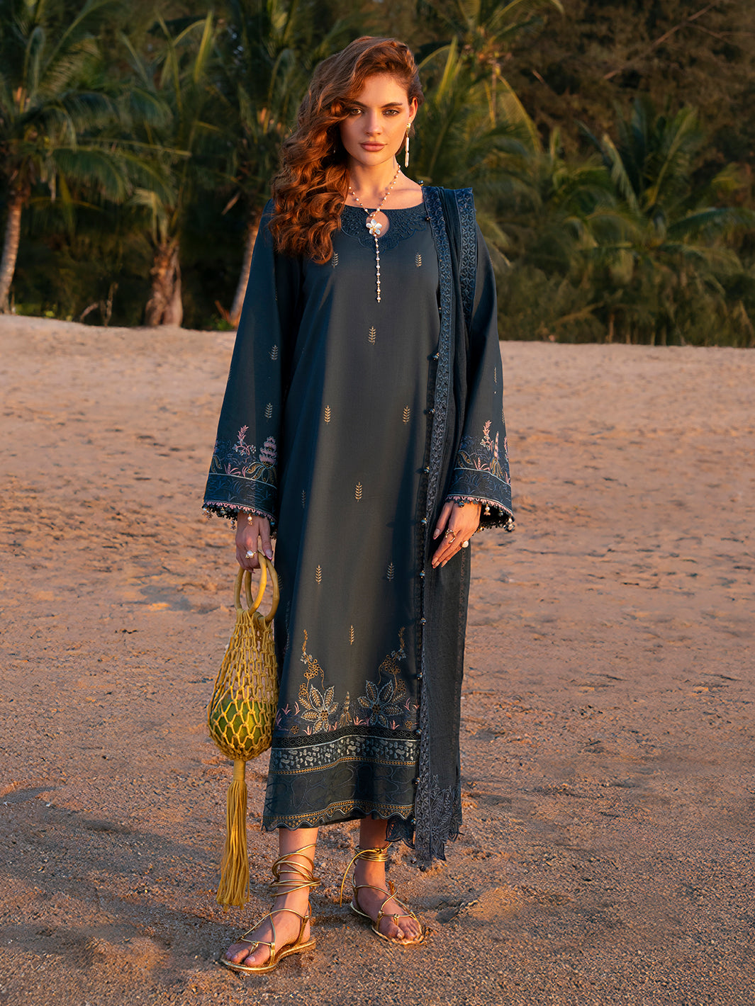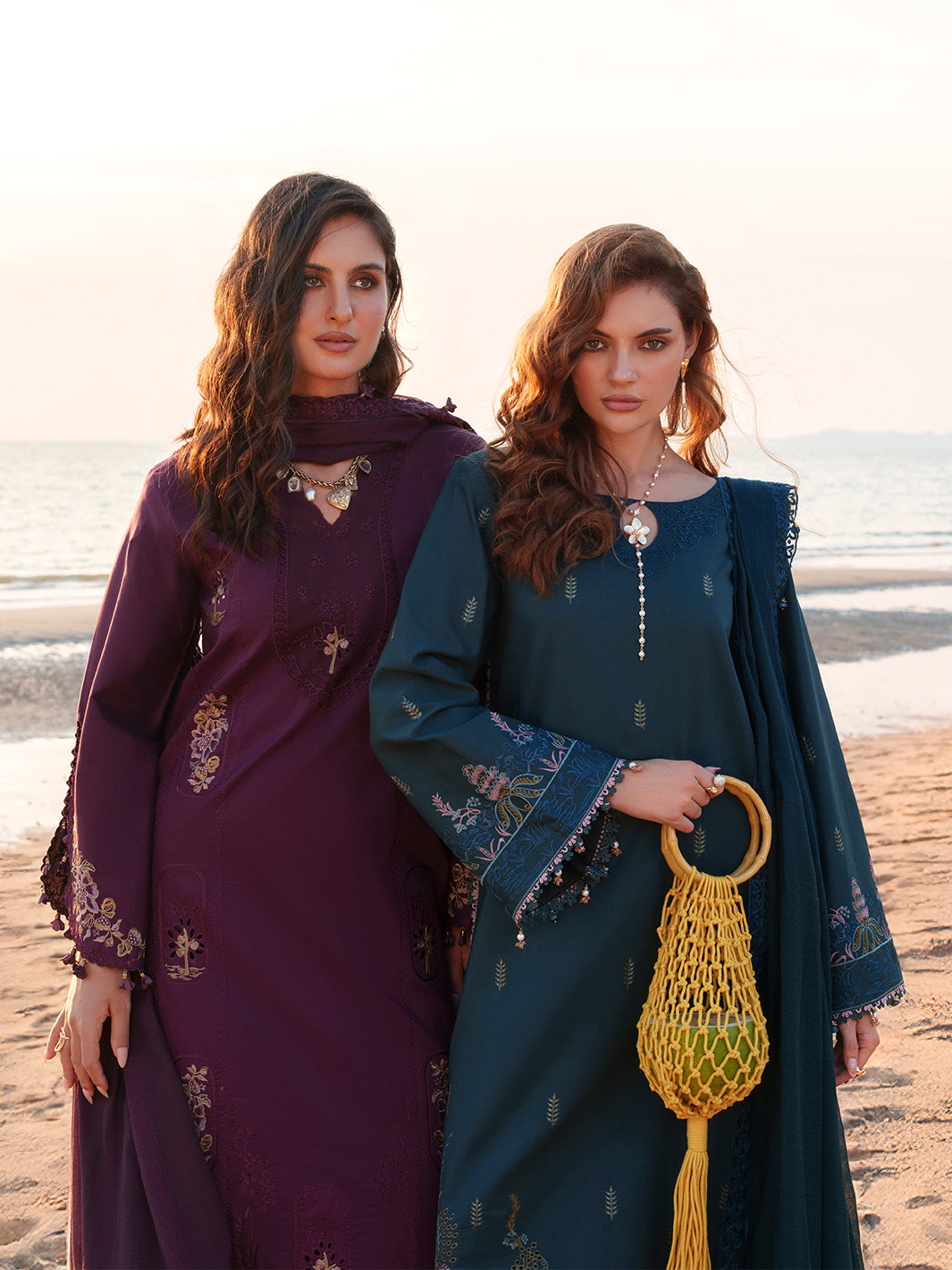From the Summer Wine Luxury Lawn collection, LEILA is a masterwork of intricate grace. This Lawn ensemble features a lavishly embroidered front and sleeves, elevated by a sophisticated trio of organza accents including a detailed neckline, front motifs, and a signature patch. Paired with tonal cotton trousers and a textured Slub Monark dupatta, it offers a majestic drape and a breath of fresh luxury.