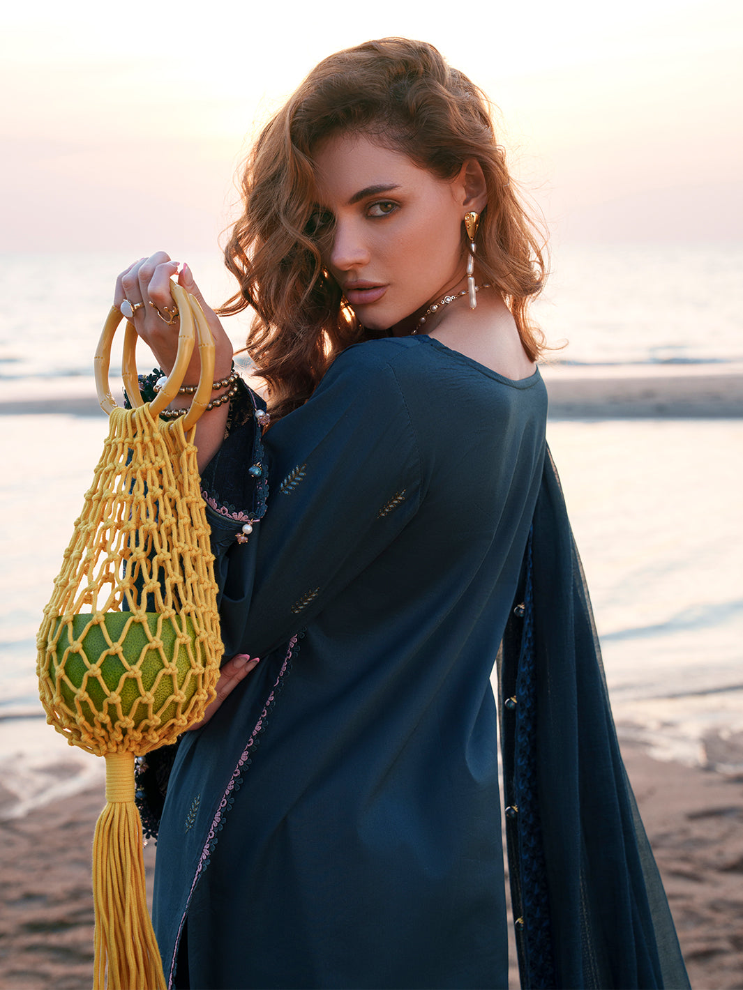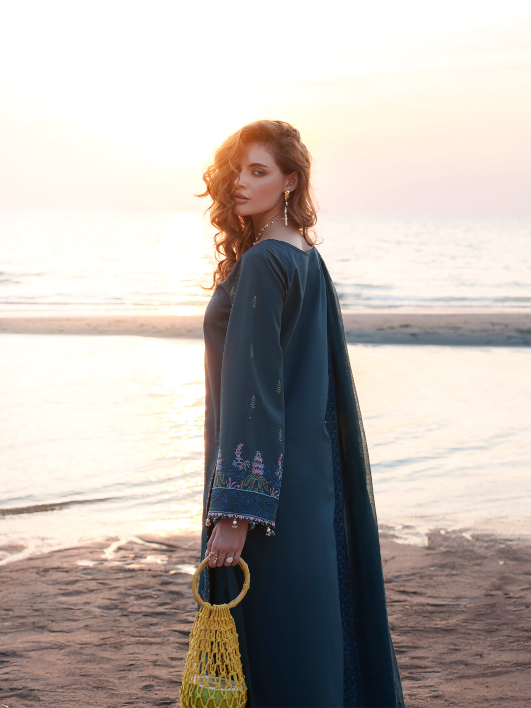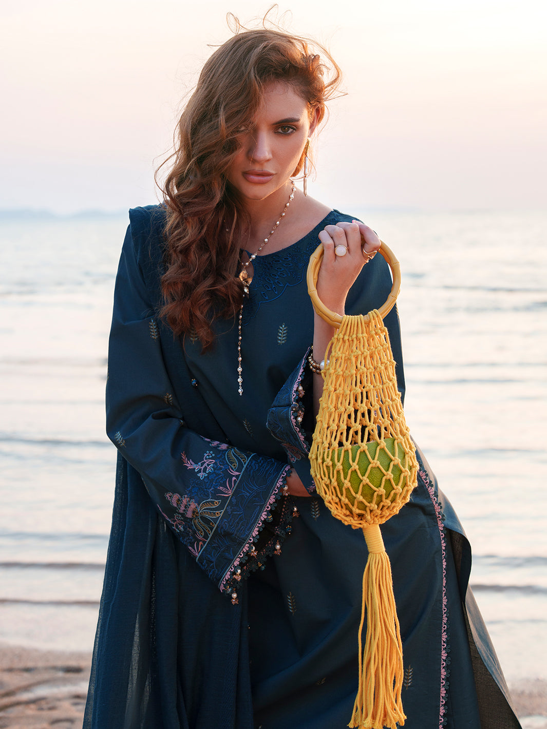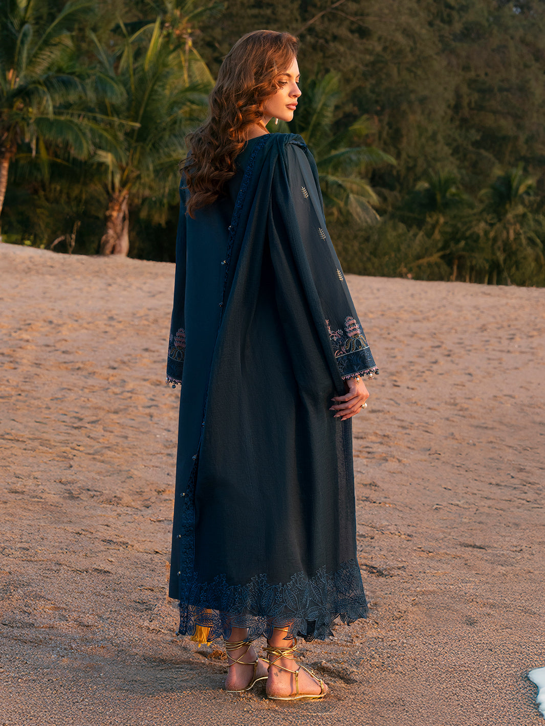 From the Summer Wine Luxury Lawn collection, LEILA is a masterwork of intricate grace. This Lawn ensemble features a lavishly embroidered front and sleeves, elevated by a sophisticated trio of organza accents including a detailed neckline, front motifs, and a signature patch. Paired with tonal cotton trousers and a textured Slub Monark dupatta, it offers a majestic drape and a breath of fresh luxury.
