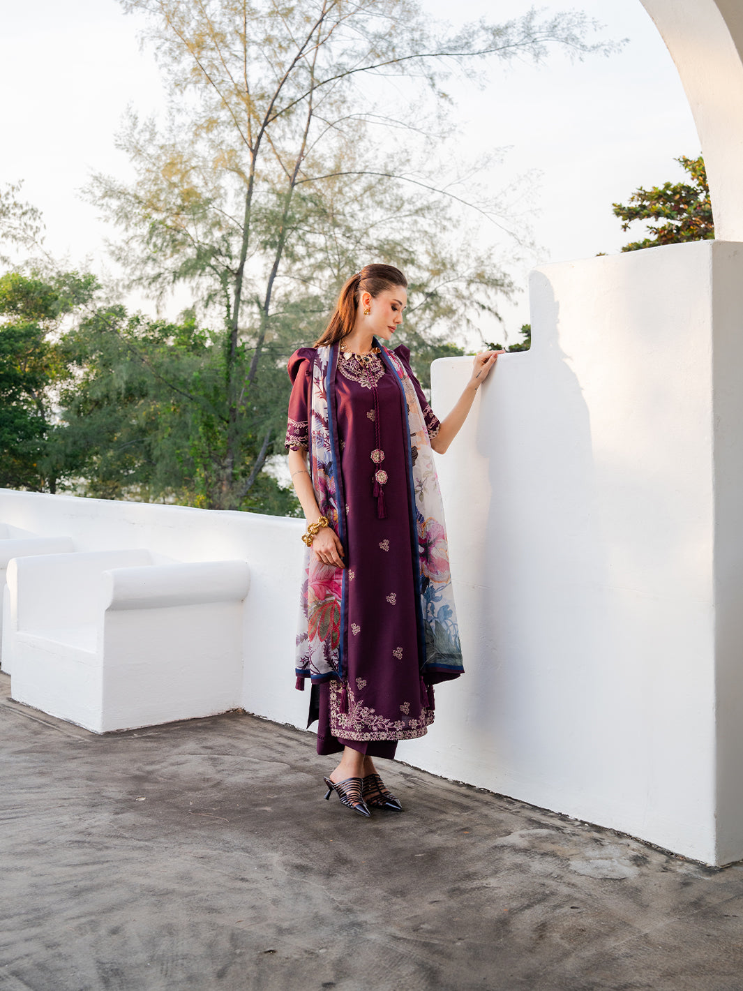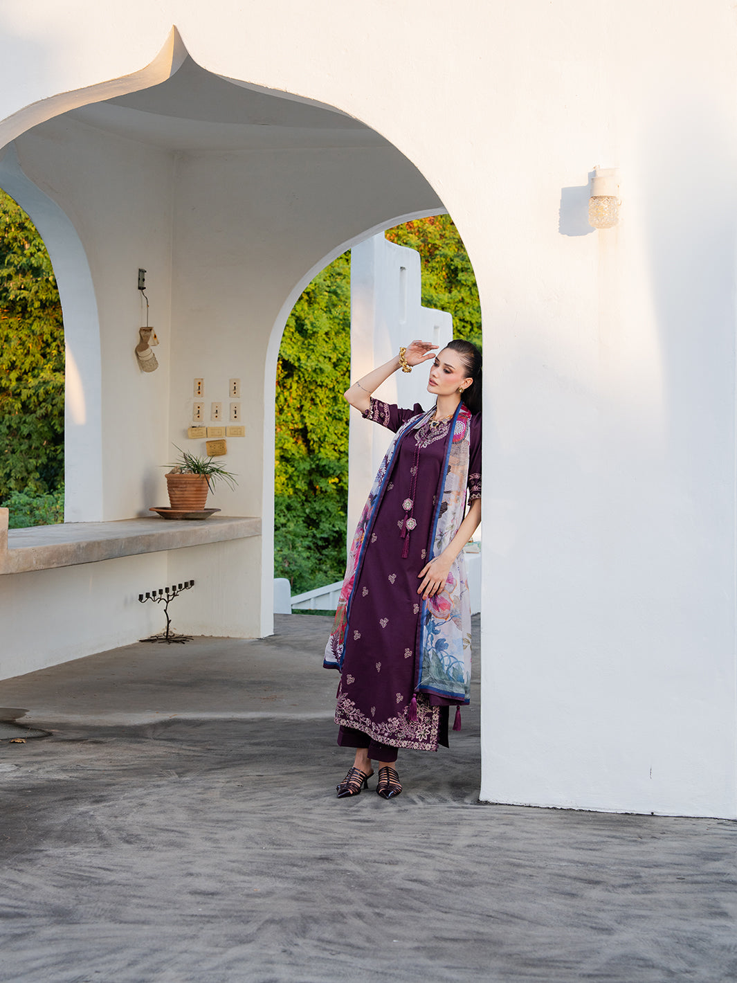 Step into effortless elegance with Meerab from the Dareen Luxury Lawn collection soft lawn fabric with intricate embroidery on the front and sleeves is paired with delicate organza patches on the neckline and sleeves while digital print silk dupatta adds a touch of vibrant artistry perfectly complemented by plain dyed cotton trousers for a look that’s timeless and refined.