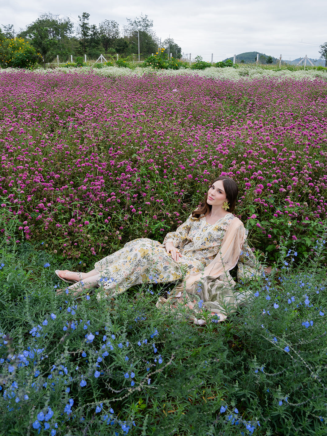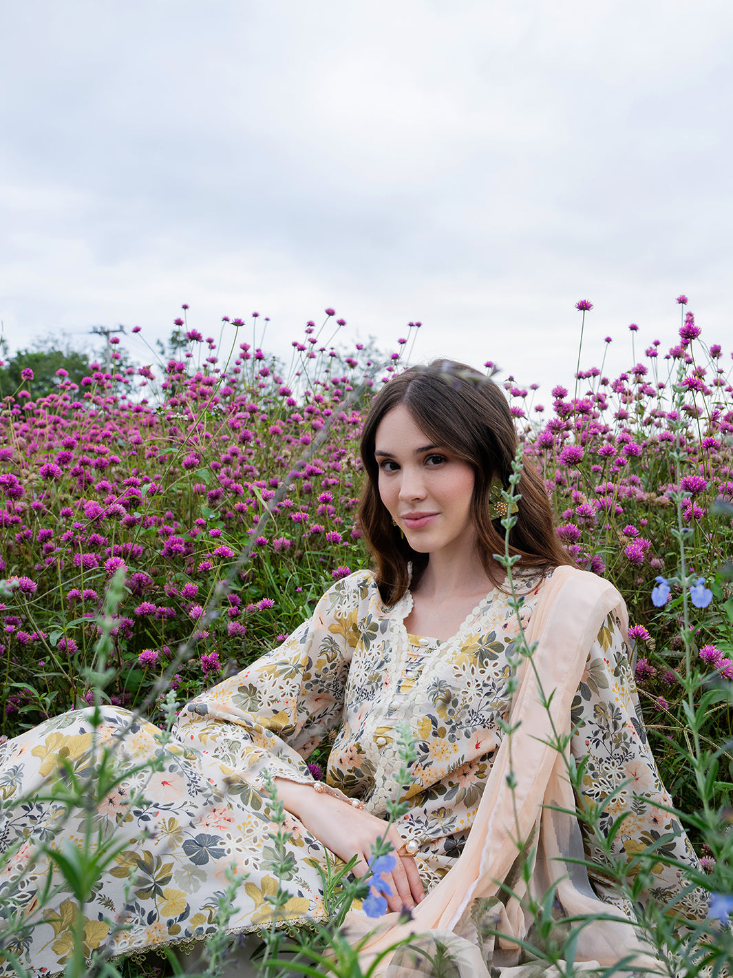 Orchid from the Oh So Cherry edit is crafted in soft digital printed lawn, featuring intricate embroidered detailing on the front and sleeves, complemented by a printed back for a harmonious design. The delicate organza neckline adds subtle sophistication, while the digitally printed chiffon dupatta drapes effortlessly to enhance its airy, light aesthetic. Paired with plain dyed trousers, Orchid offers a refined blend of comfort, elegance, and breezy summer charm, making it a timeless choice for warm, sunlit days.