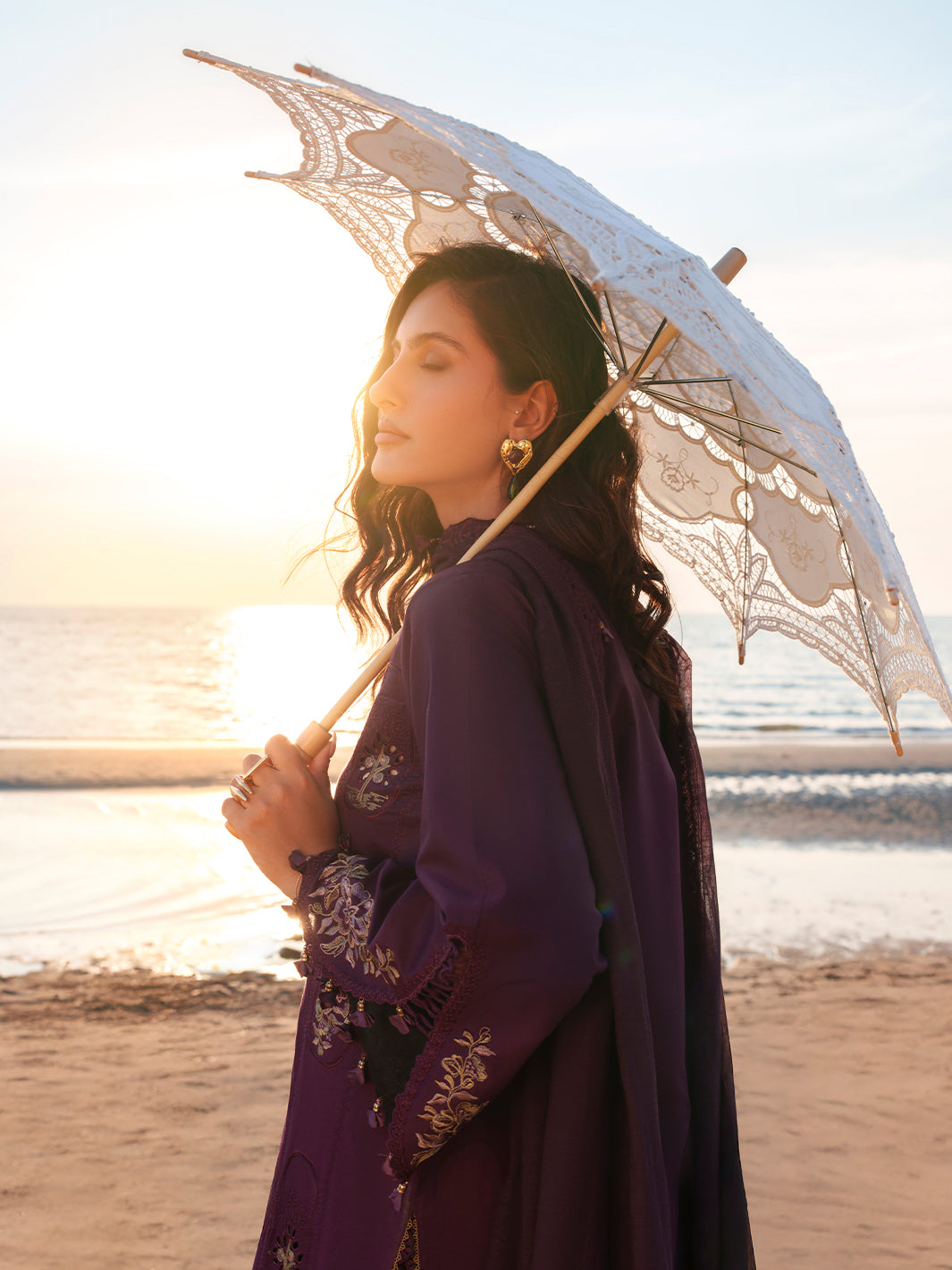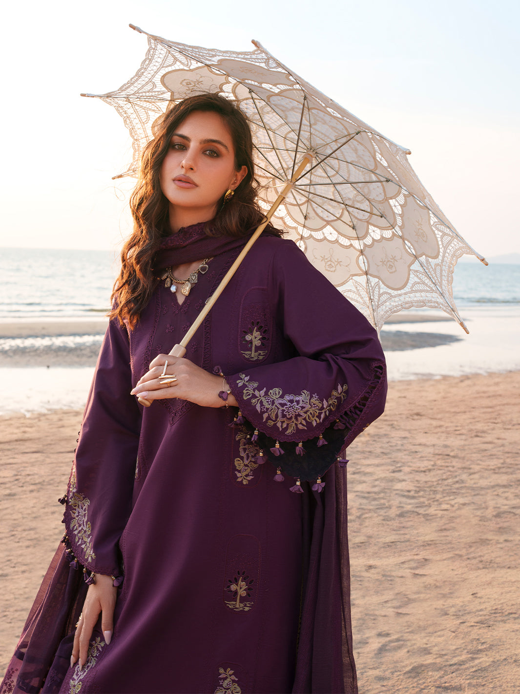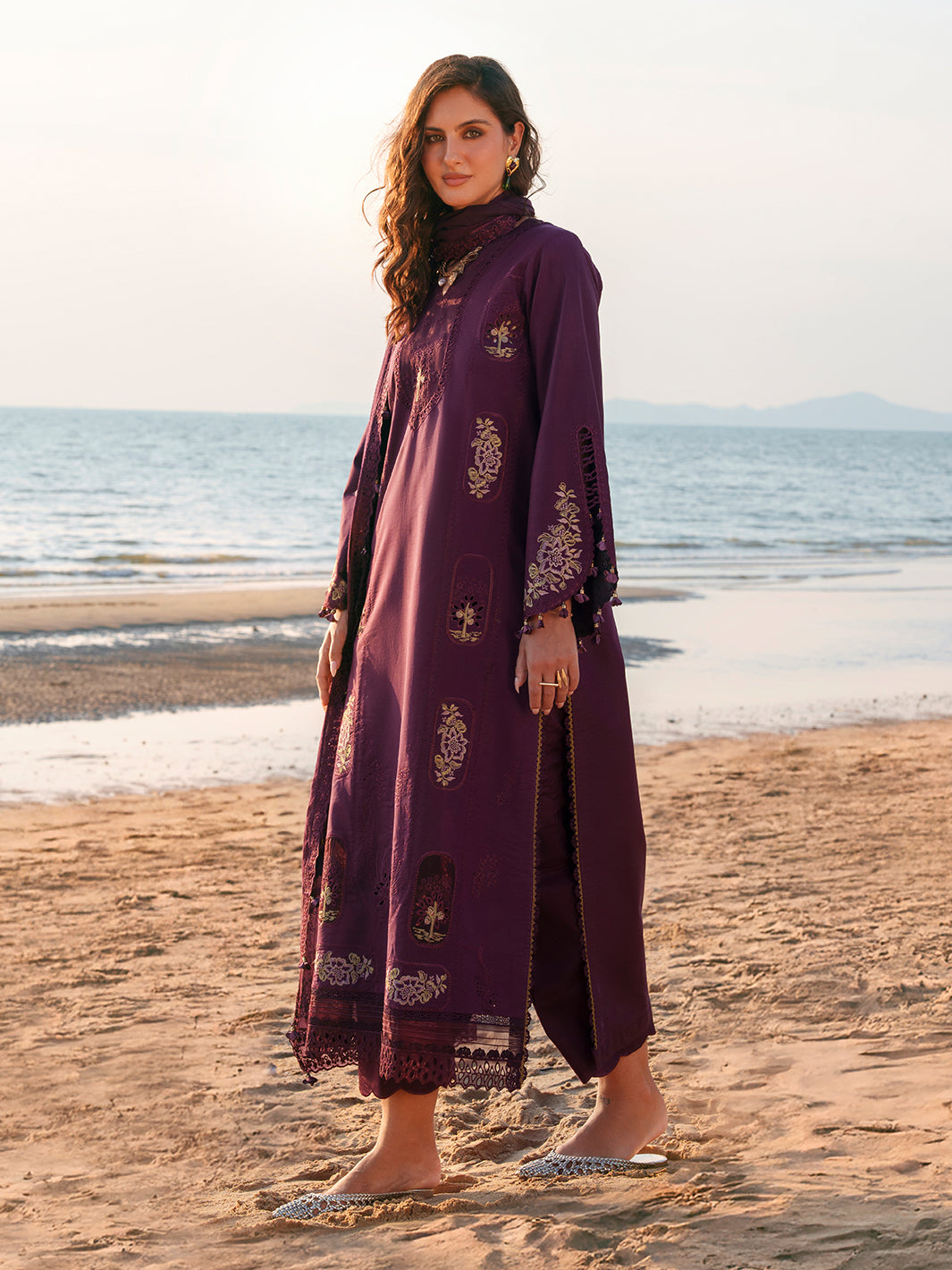 From the Summer Wine Luxury Lawn collection, VEIL is an exquisite display of sartorial finesse. This Lawn creation features a lavishly decorated front and sleeves, enhanced by a trio of organza accents including a detailed neckline, ornate motifs, and a signature hem patch for a multi dimensional couture feel. Balanced by sleek dyed cotton trousers, the ensemble is crowned with a beautifully finished Slub Monark dupatta offering a rich granular texture and an air of ethereal prestige.