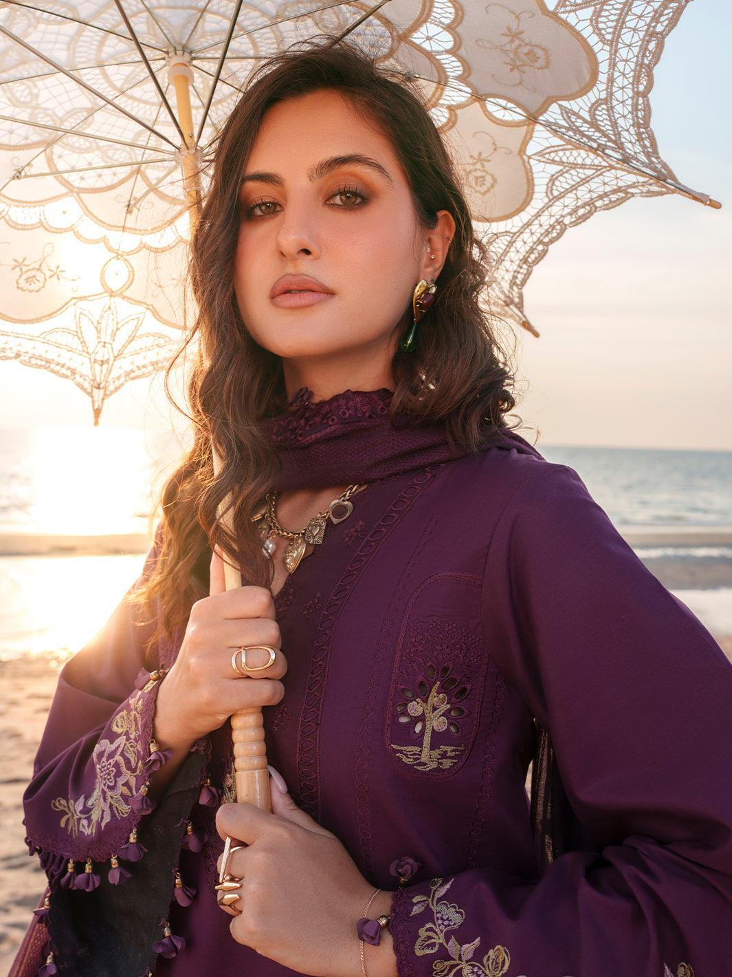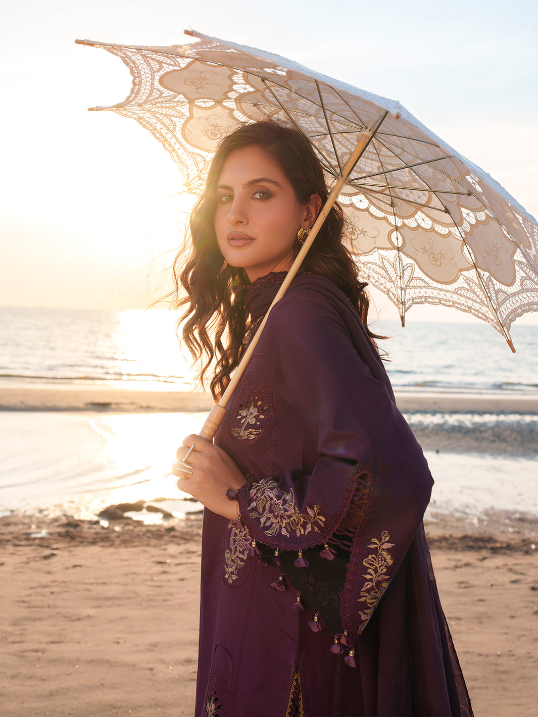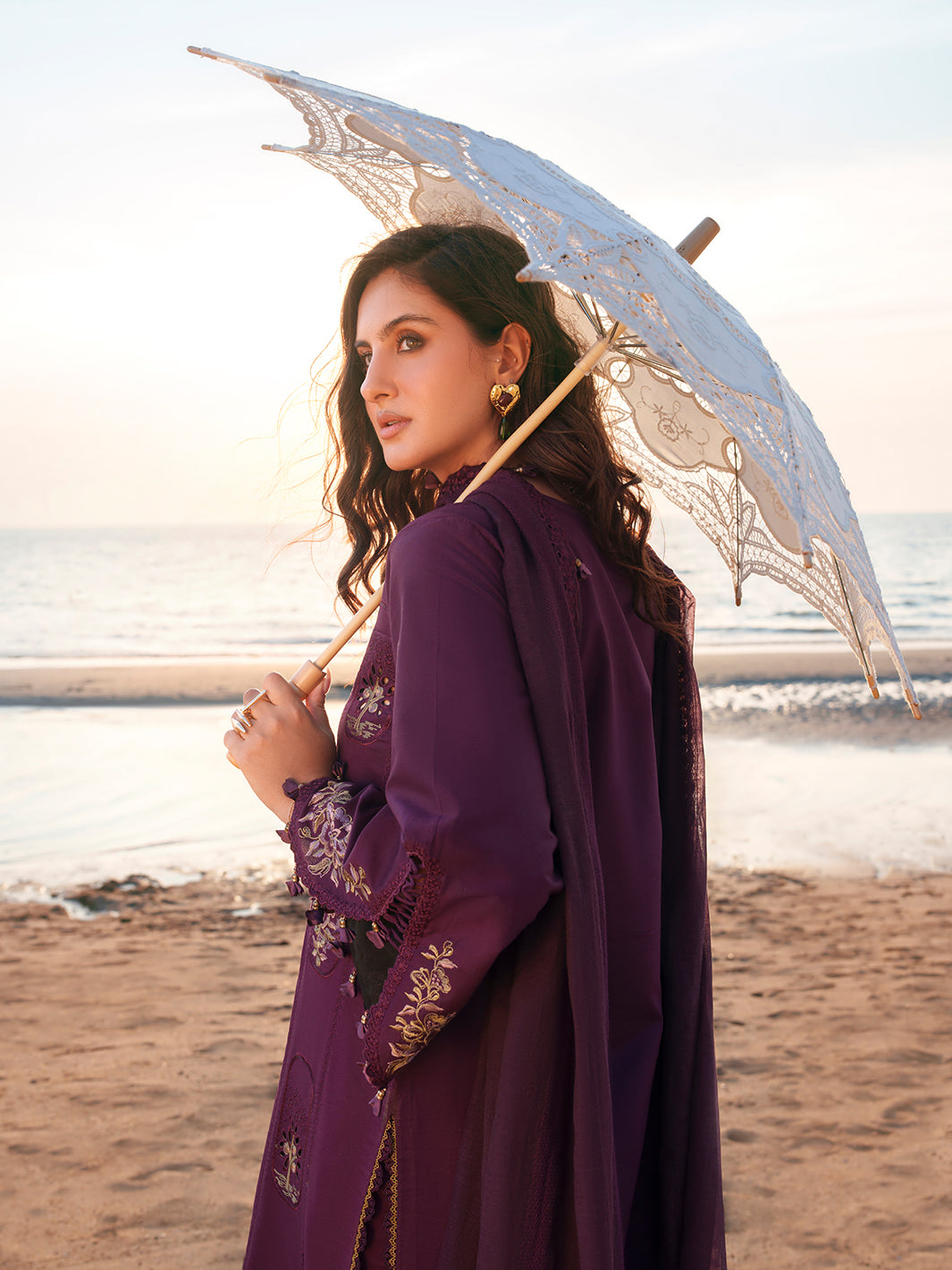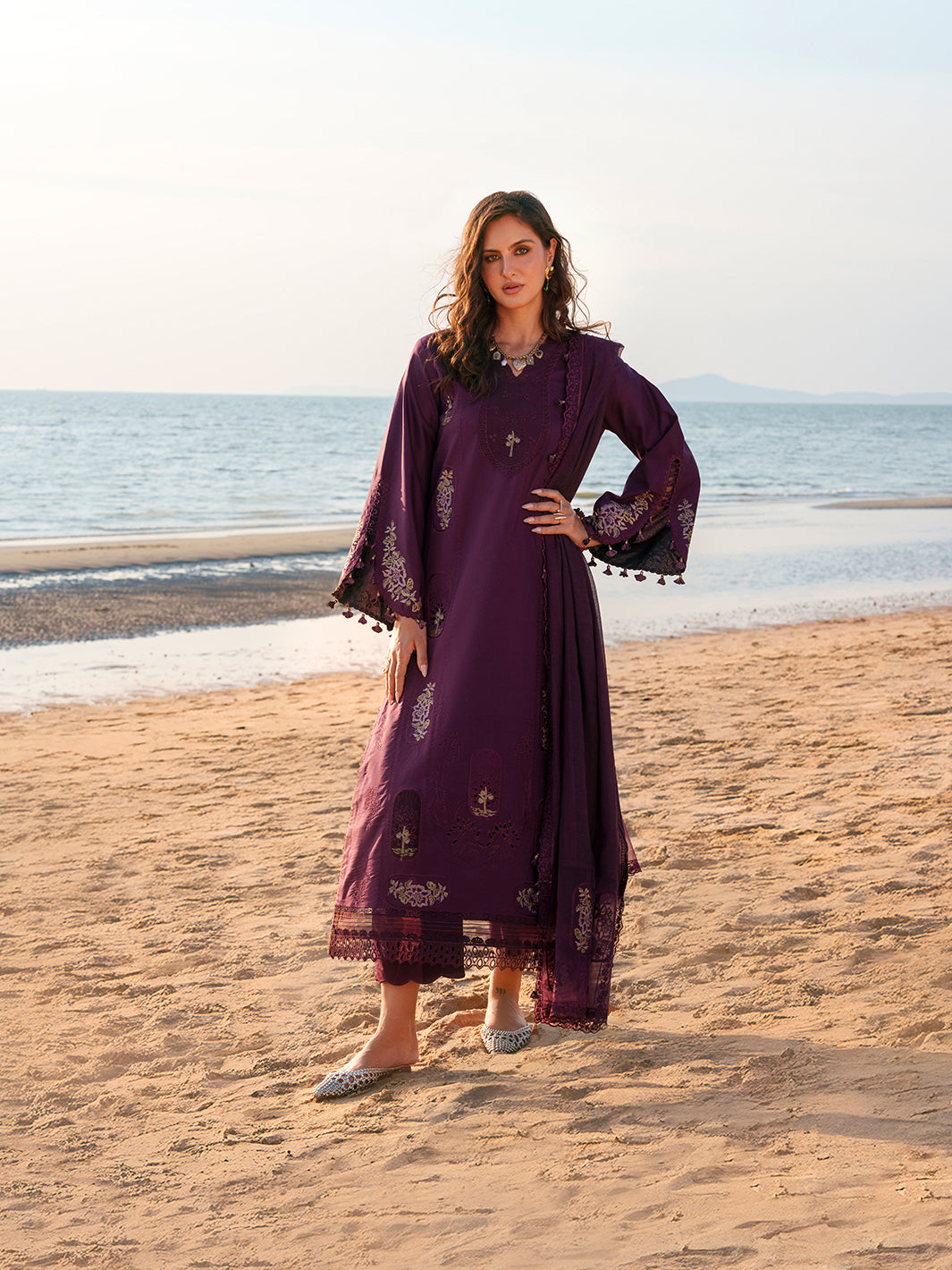 From the Summer Wine Luxury Lawn collection, VEIL is an exquisite display of sartorial finesse. This Lawn creation features a lavishly decorated front and sleeves, enhanced by a trio of organza accents including a detailed neckline, ornate motifs, and a signature hem patch for a multi dimensional couture feel. Balanced by sleek dyed cotton trousers, the ensemble is crowned with a beautifully finished Slub Monark dupatta offering a rich granular texture and an air of ethereal prestige.