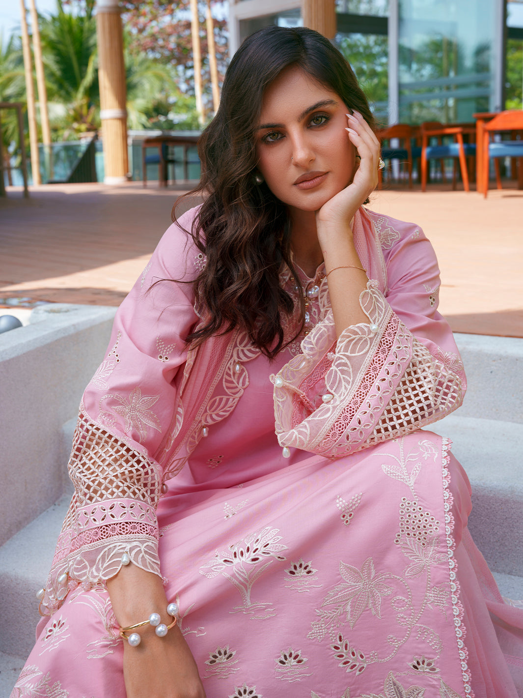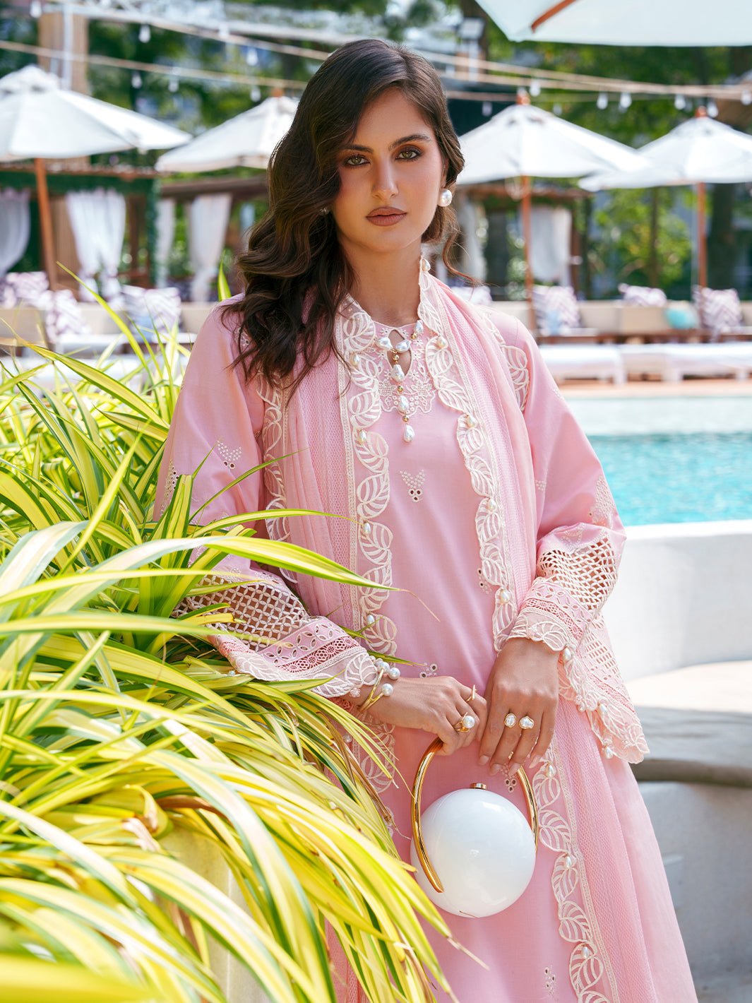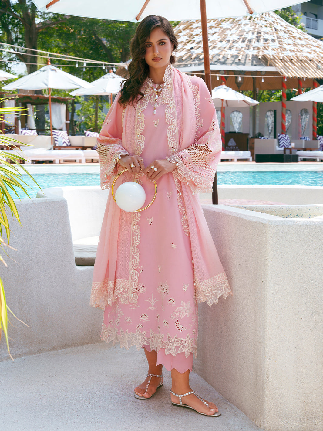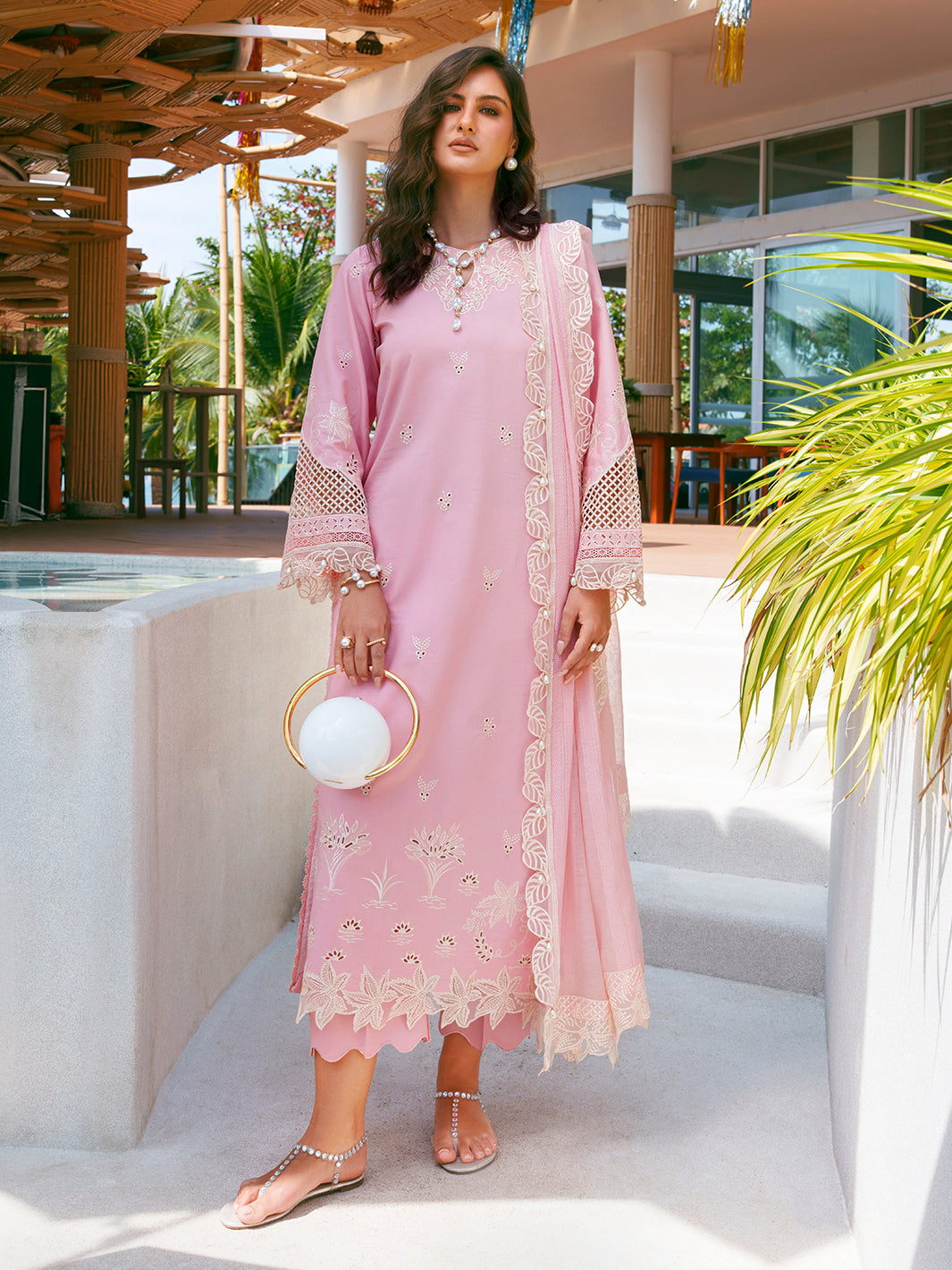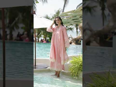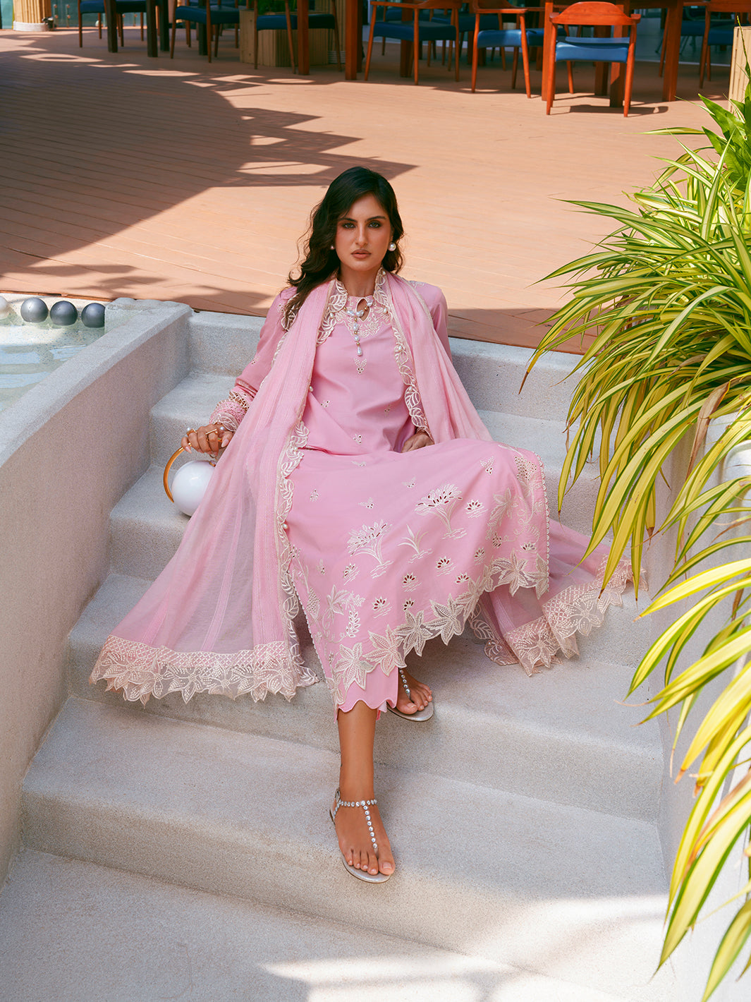 VIANA is a masterclass in summer opulence. This ensemble features a premium Lawn shirt boasting a lavishly embroidered front and sleeves, complemented by delicate organza accents on the neckline and cuffs. Paired with sleek plain cotton trousers and a uniquely textured Slub Monark dupatta, this look offers a regal drape and sophisticated finish. It is the ultimate choice for those seeking effortless, high end grace.