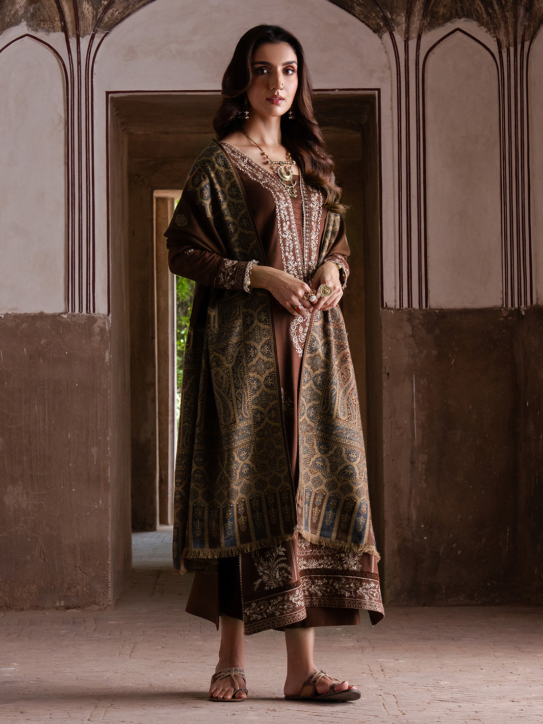 Manzil" from Izel’s nooraniyat Embroidered Winter Collection ’25 captures the essence of winter sophistication with its luxurious Italian wool base. The shirt features an intricately embroidered front and sleeves, balanced by a plain-dyed back for a touch of minimalism. Paired with a warm woolen jacquard shawl and a plain-dyed trouser, this three-piece ensemble blends comfort with timeless elegance, making it a perfect choice for serene winter evenings and festive gatherings.