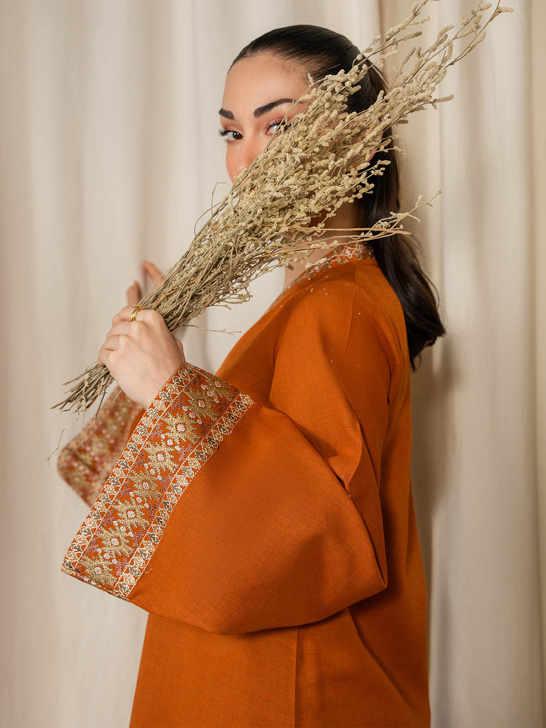 Step into effortless elegance with Esme from the Summer Karandi Pret collection. Featuring an embroidered karandi shirt paired with plain dyed karandi trousers, this ensemble is perfect for a contemporary, chic summer look